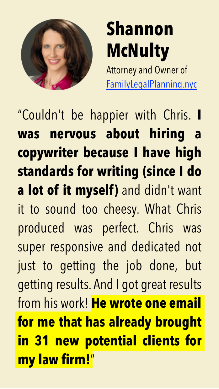 "Chris wrote one email for me that has already brought in 31 new potential clients for my law firm."
